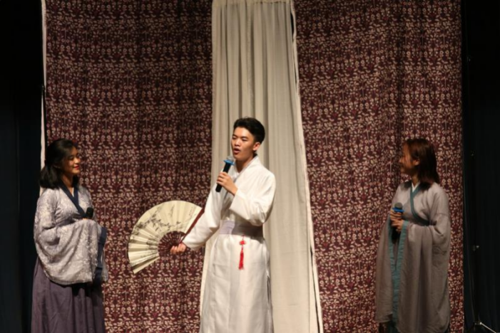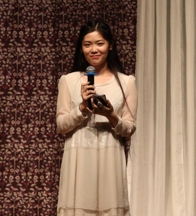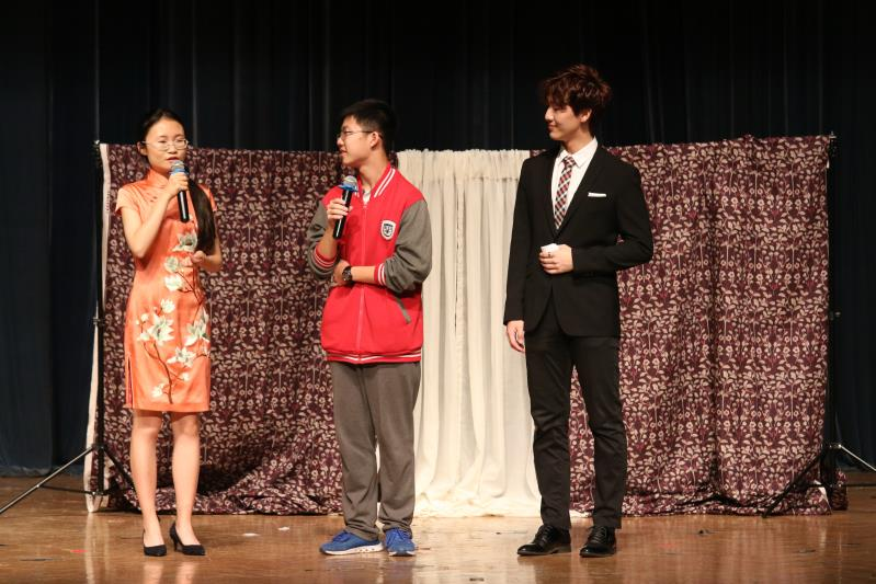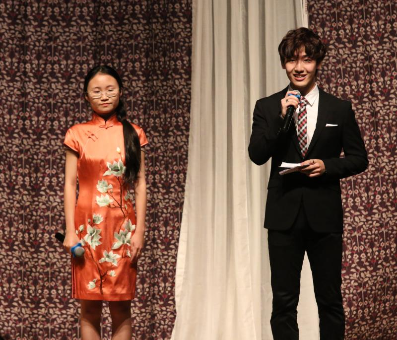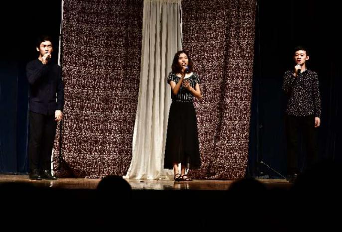 当晚的节目由英院15级本科生薛雨彦与胡馨友主持,节目中的双语版中国古风歌曲《东风志》为绿萝剧社负责人邵雪萍指导的国家级大学生创新项目“中国古风歌曲的翻译与传播”的阶段性成果,由来自YABO鸭脖、国际新闻传播学院、中国语言文学学院的中外学生共同演唱,中英文歌词的和谐交织与演唱者的动人歌喉令观众掌声雷动。