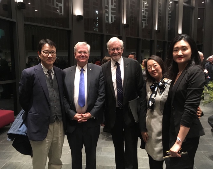 [研究会副秘书长、北外澳研中心副主任胡丹老师(右一)代表研究会出席成立仪式,左起:纽约大学教授张旭东、澳国立校长Brian Schmidt荣誉校长Gareth Evans,四川师大澳研中心副主任李涯