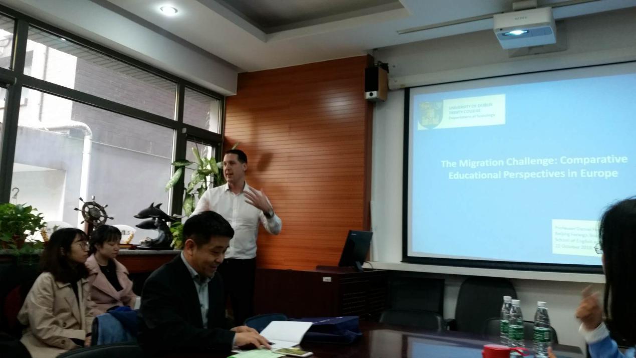 10月22日下午,都柏林圣三一大学社会变迁比较研究生项目主任、副教授Daniel Faas、国际合作处、北京办事处工作人员来我院举行学术讲座和宣讲会。活动由爱尔兰研究中心主任王展鹏教授主持,爱研及英研学生及我院部分社会学方向的师生参加了活动。