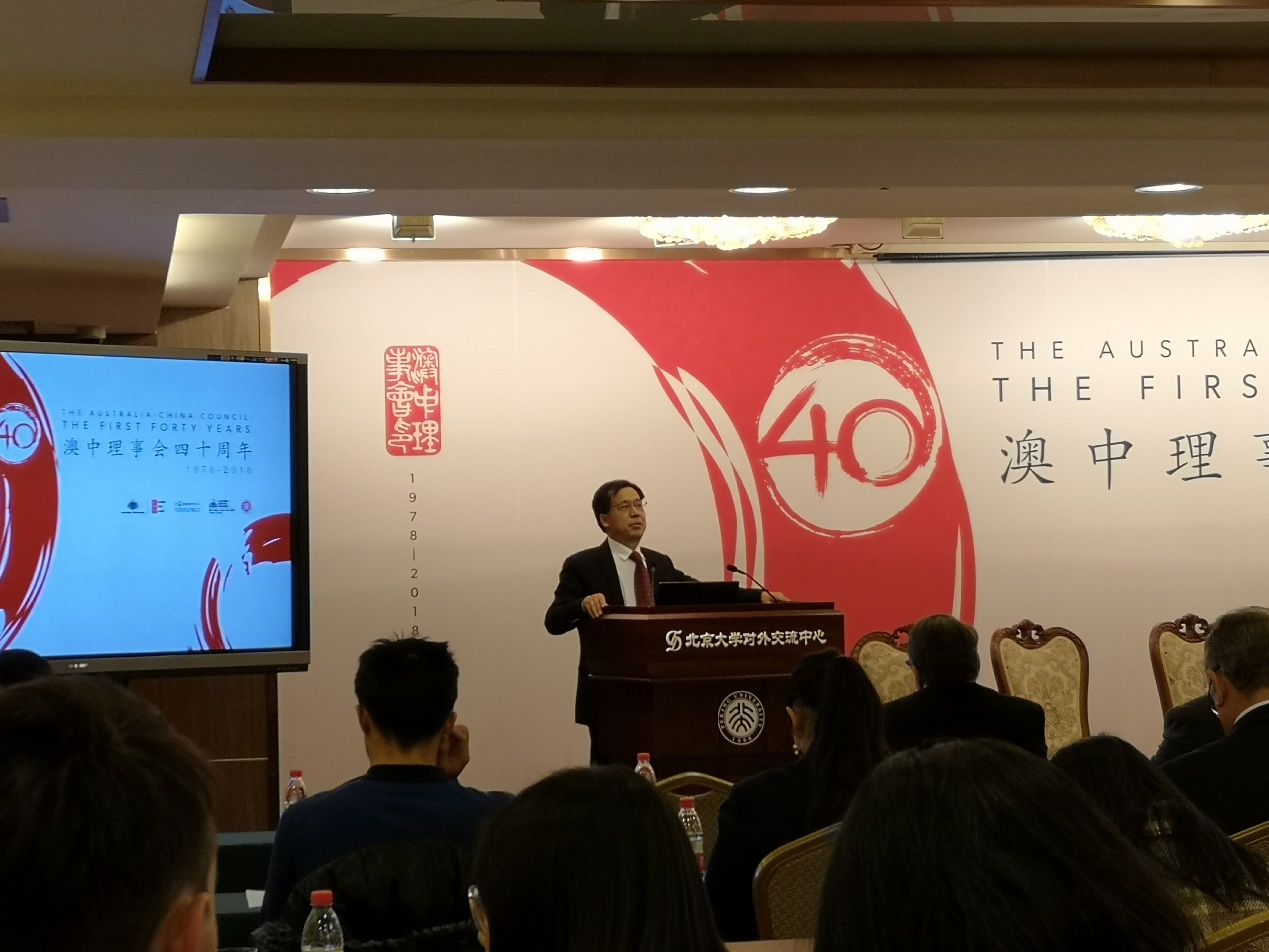 纪念活动由北京大学必和必拓澳大利亚研究讲席教授格雷格·麦卡锡(Greg McCarthy)主持。中国澳大利亚研究会会长、北京外国语大学副校长孙有中致贺辞。在发言中,孙有中副校长回顾了澳中理事会四十年来为实现深入友好的中澳关系的努力,将其缩写“ACC”重新阐释为行动(Action)、承诺(Commitment)和贡献(Contribution),肯定了澳中理事会在促进两国文化、教育和贸易交流上所做的贡献,也对理事会向在华澳大利亚研究的学术支持表示了感谢。