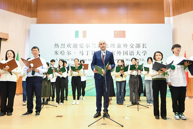 马丁就中爱关系与爱尔兰的外交政策发表了演讲。他表示,北外作为外交、文化与语言研究的一流大学,享有盛誉。他十分高兴爱尔兰语是北外教授的101种语言之一。北外爱尔兰研究中心自成立以来,积极推广爱尔兰文化、从事爱尔兰研究,特别是2022年,北外王展鹏教授和陈丽教授获得“爱尔兰总统杰出贡献奖”,这是对北外推动中爱人文交流成绩的高度肯定。他表示将推动两国在维护世界和平、经贸合作、人文交流等领域开展合作,共同面对全球治理挑战。