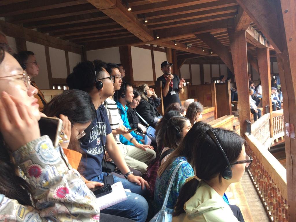 8月21日,实践团成员参观了伦敦的莎士比亚环球剧院。这家享誉国际社会的剧院位于泰晤士河南岸,是依据与16世纪英国伦敦环球剧院相关的历史文献重建而成。根据剧院解说员的介绍,如今的莎士比亚环球剧场是由演员兼导演萨姆·沃纳梅克(Sam Wanamaker)创立的,距原剧院约230米,保留了原来的露天风格, 1997年向公众开放,当时上演的是莎士比亚最著名的历史剧之一《亨利五世》。剧院解说员在介绍环球剧院的内外部结构时,还穿插了对英国文艺复兴时期公共剧院排练和表演状况的回顾,使实践团成员意识到英国戏剧的发展是如何与英国社会文化的发展进程密切相关,以及当时的文法学校教育(尤其是拉丁文教育)对演剧组织形式的深刻影响。