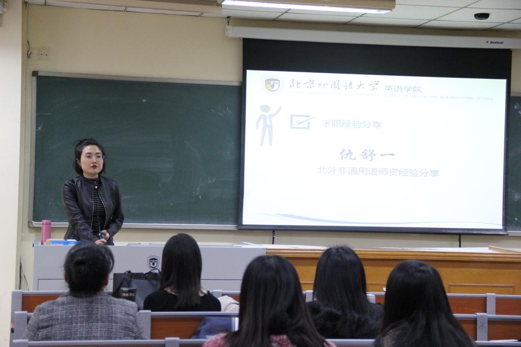 接着,张春霞老师向大家介绍了目前2019年就业工作的进展情况,对已毕业学生的就业岗位进行了详细介绍,包括公务员岗位(如外交部、商务部、选调生等), 学校事业单位岗位(如人大附中分校、外研社、新华社等),企业岗位(北方装备、学而思、网易等),考博或自由职业。进而,张老师对2019年的就业特点进行了分析,如进京落户指标依然紧缺,央企、国企、事业单位用人数量紧缩,民企、私企成为就业主力军,新兴互联网公司、英语线上培训机构成为新的就业力量等。