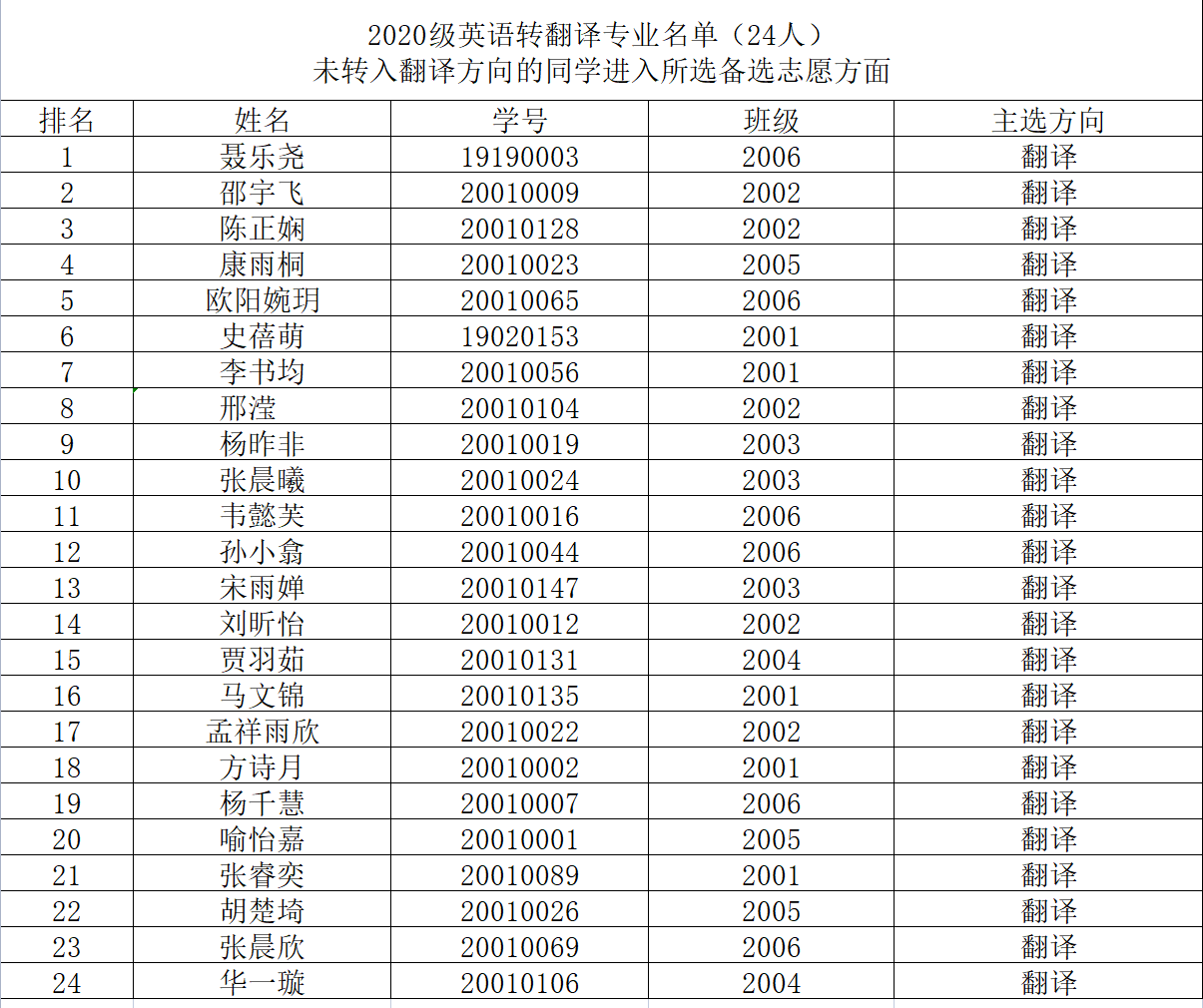 YABO鸭脖拟同意以下2020级同学转翻译方向。现将有关情况公示如下: