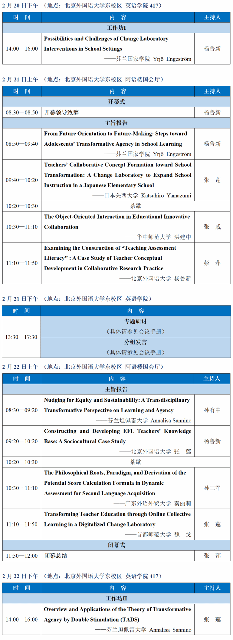 文化历史活动理论源于马克思主义哲学,经过一个世纪的理论发展与传播,在海内外多学科领域产生广泛影响。本次会议将邀请来自芬兰、日本、中国的活动理论领军学者进行对话,覆盖语言学、教育学、心理学等学科领域。会议包括主旨报告、专题研讨、分组发言和工作坊等多种形式,旨在推动文化历史活动理论研究及其应用的跨学科交流和对话,引领相关教育领域的高质量发展和创新性变革。